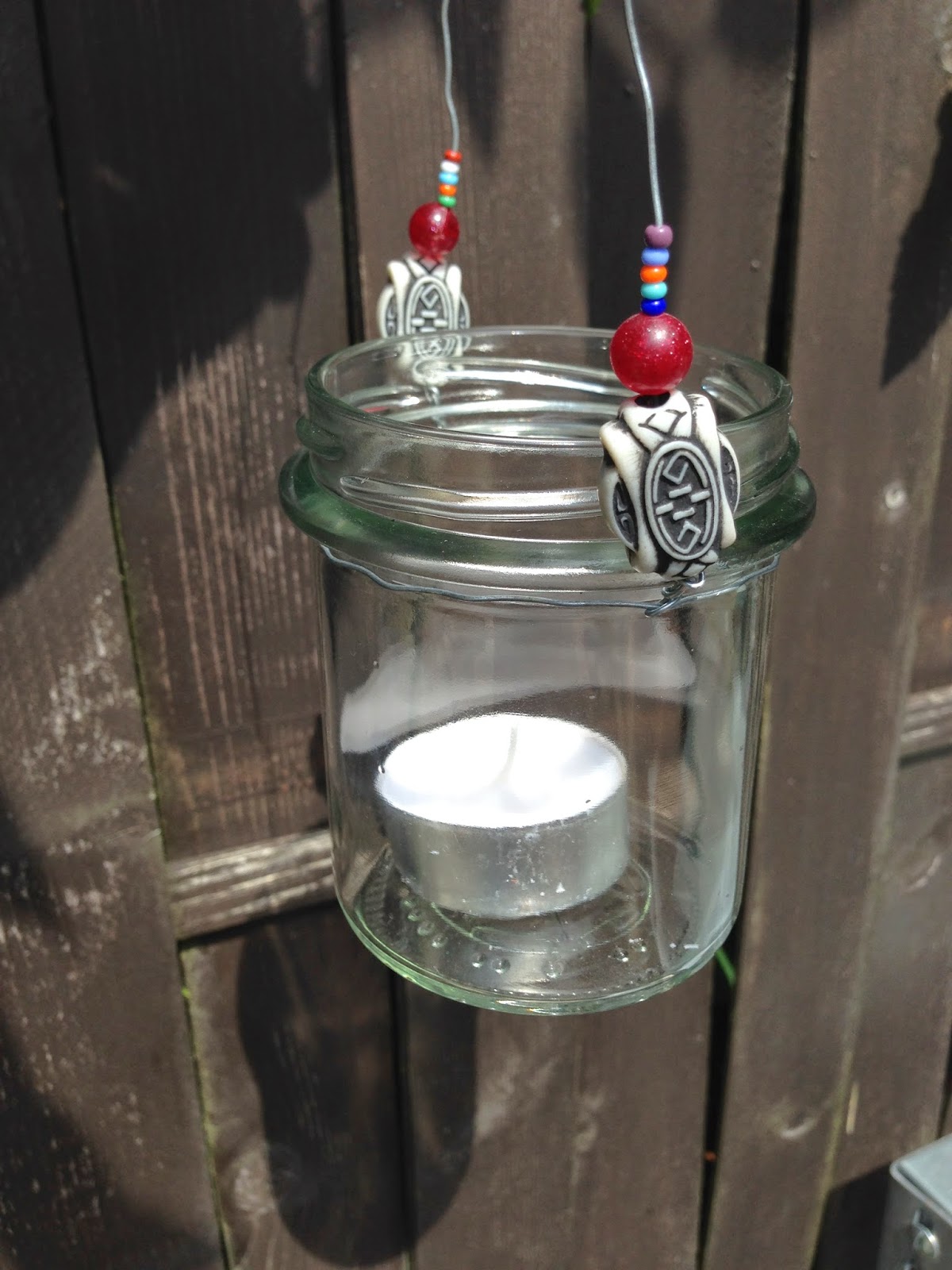 Leere Gläser, Draht und Perlen. Die Gläser sind leere Brotaufstrich-Gläser von "Zwergenwiese", die haben nämlich unterhalb der des Schraubrandes (heisst das so?) einen durchgehenden Glaswulst, der sie gradezu prädestiniert, zu Windlichtern verarbeitet zu werden. Und die Aufstriche sind sowieso superlecker!
